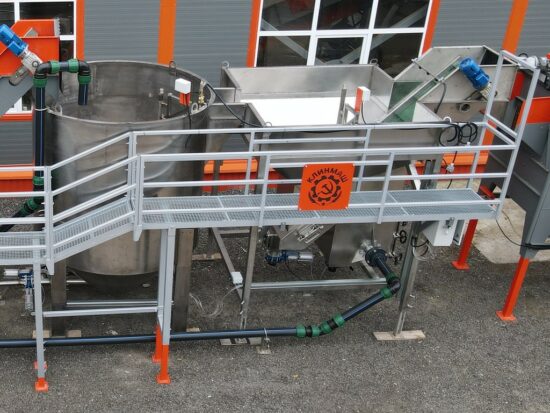 - Электрические опрокидыватели в единой раме с накопительным бункером (очень компактно размещается и позволяет переворачивать контейнер на все 180 градусов)
