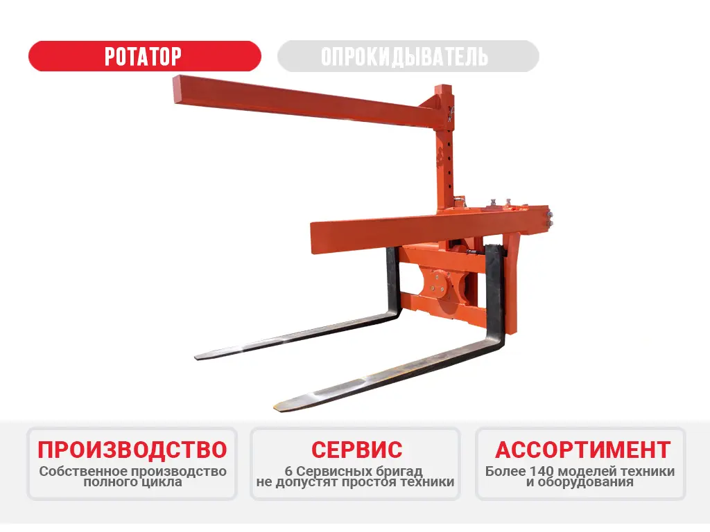 Ротатор фиксируется на каретку вилочного погрузчика и подключается к его гидросистеме. Контейнер во время работы фиксируется боковым и верхним механизмами прижима, которые регулируются под габариты ящика. Погрузчик с контейнером передвигается к месту выгрузки, водитель погрузчика подает команду на опрокидывание из кабины.