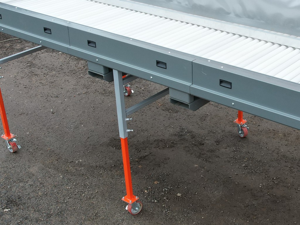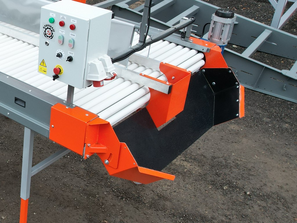 Продукт через обрезиненную приемную горловину попадает на вращающееся роликовое полотно. Вращение роликов осуществляется мотор-редуктором с помощью приводных звездочек и цепей. Продукт движется по роликам, и за счет их вращения вращается сам. Операторы осматривают продукт с обеих сторон и отбрасывают некондицию и мусор в разделитель потоков, находящийся по центру роликового полотна.