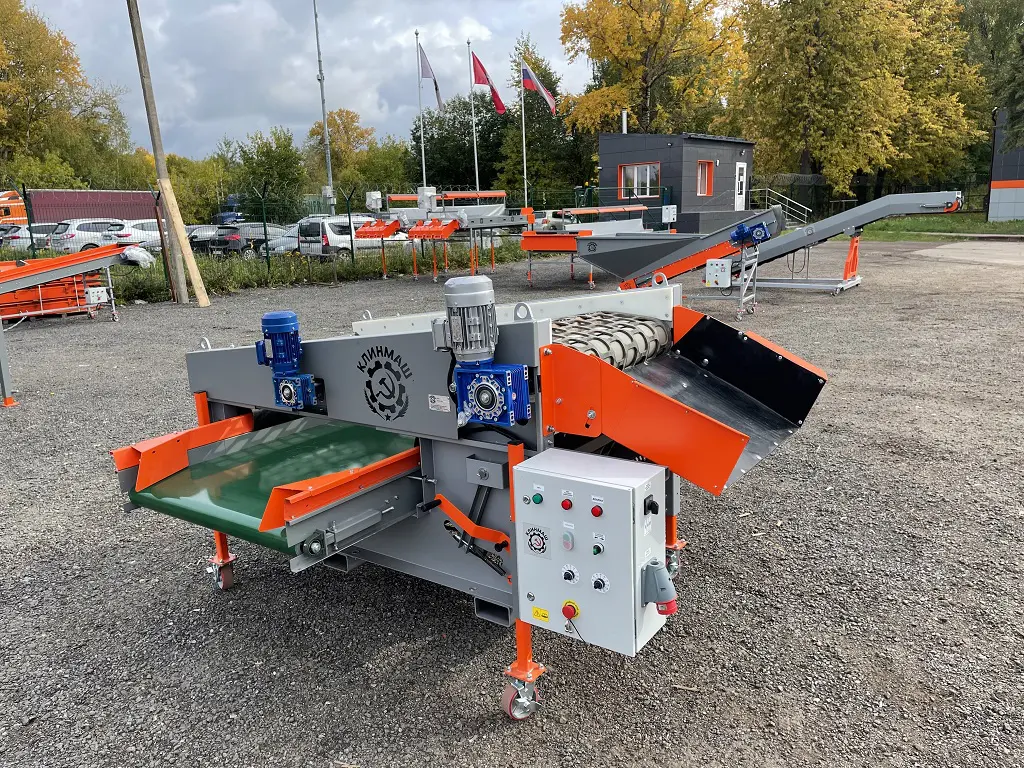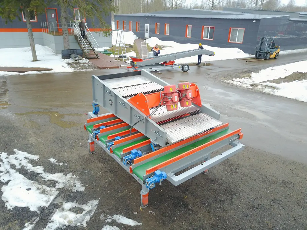 Продукт по загрузочному транспортеру поступает на горизонтальный распределительный транспортер и далее на верхние сита с самой крупной ячейкой. Происходит специально запрограммированная неравномерная вибрация, в результате которой более мелкий продукт проваливается вниз на следующий ряд сит с менее крупной ячейкой, до самой мелкой и мусорной фракции.