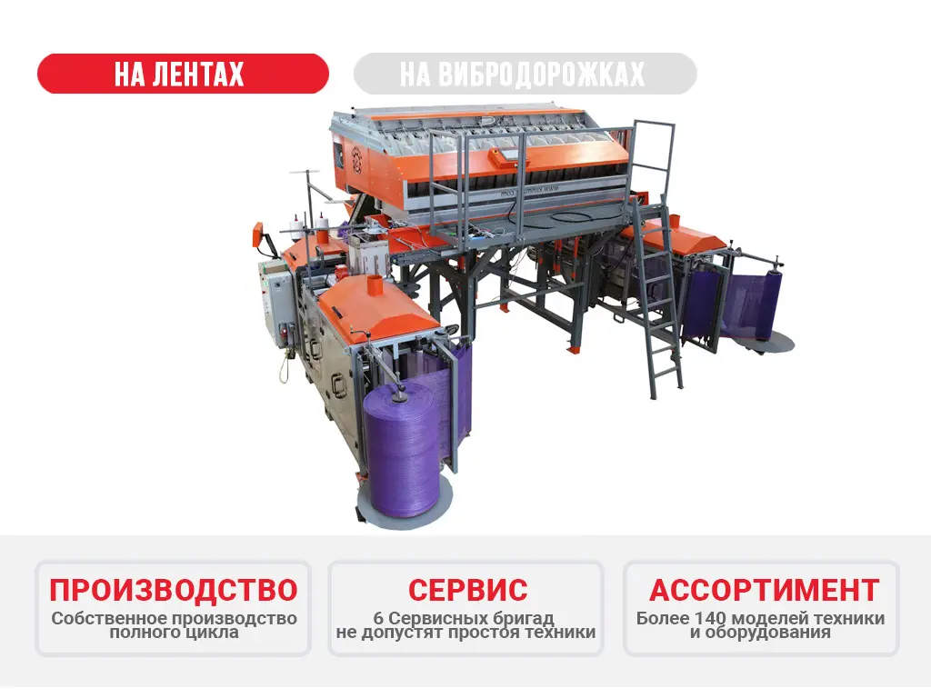 - Реверсивный разгрузочный ленточный транспортер позволяет работать одновременно с двумя упаковочными машинами.