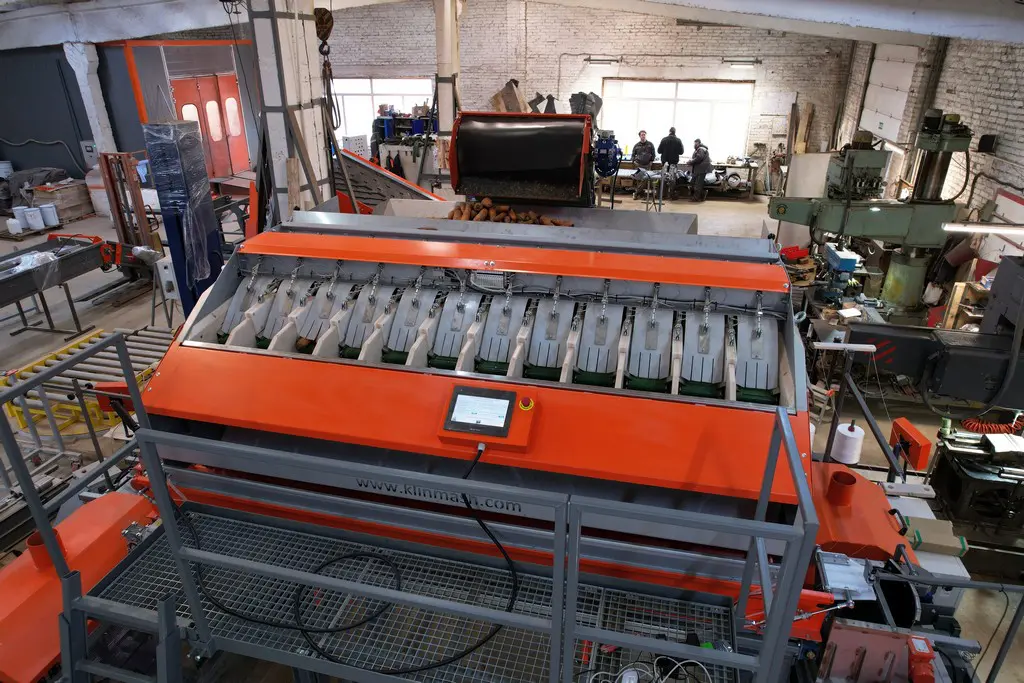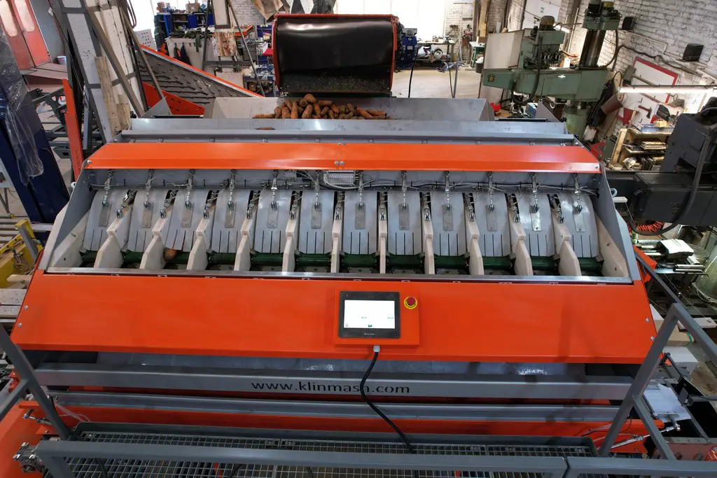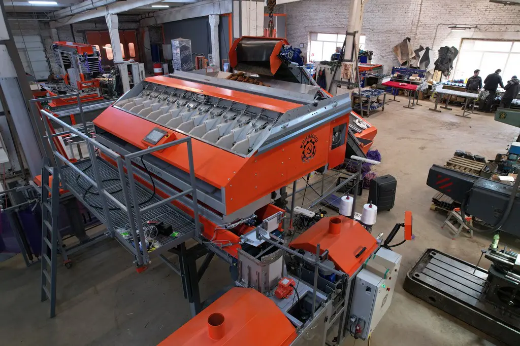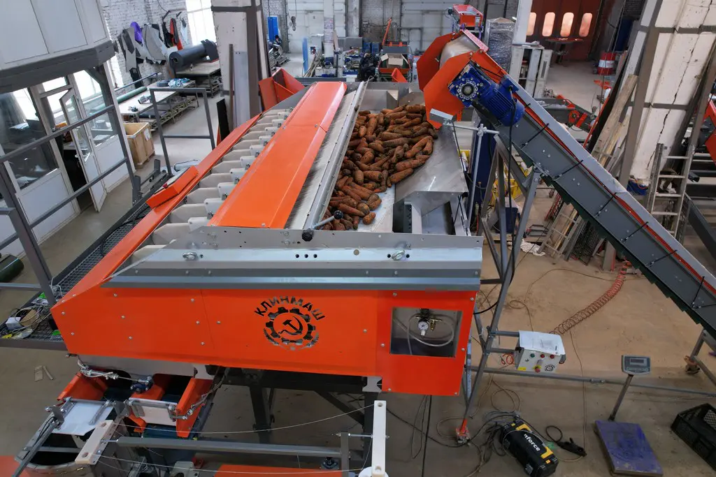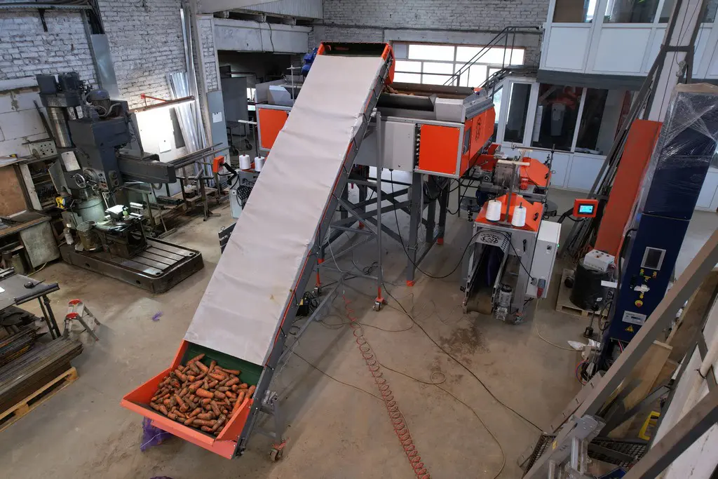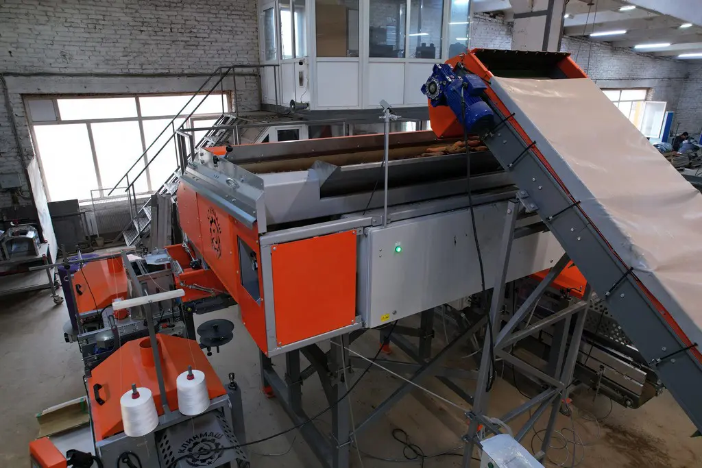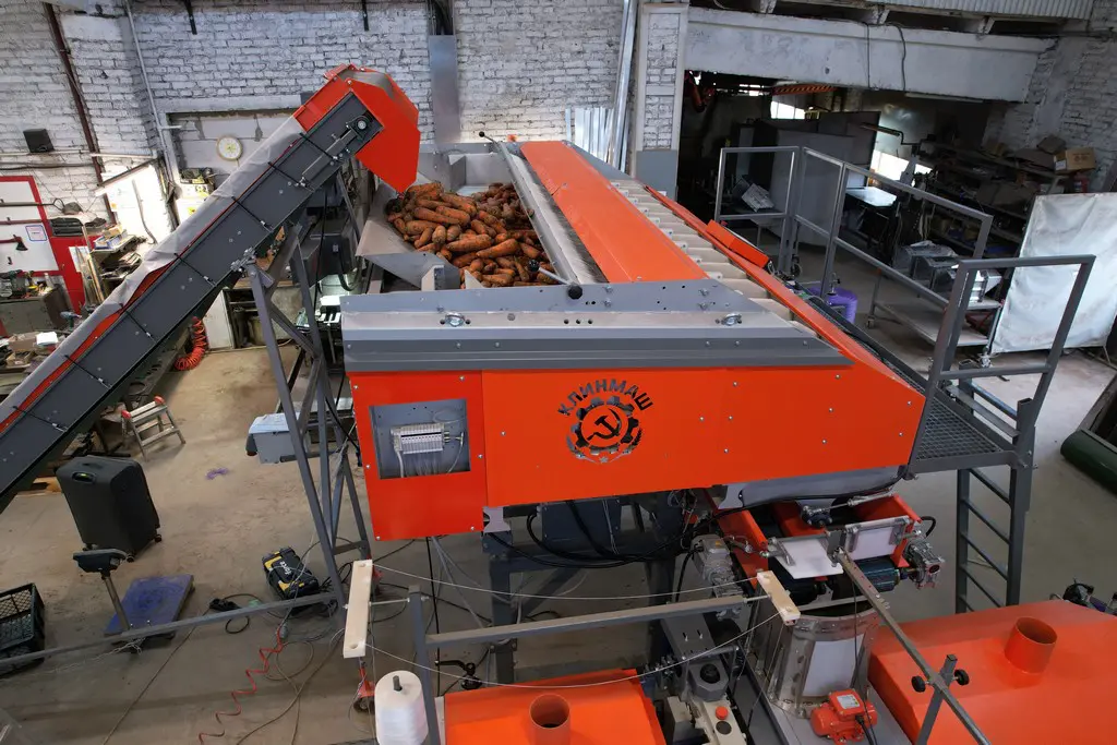 - Лента реверсивного транспортера, на которую выгружается продукт из бункера накопителя, оснащена специальными демпферными подушками для мягкого падения овощей.