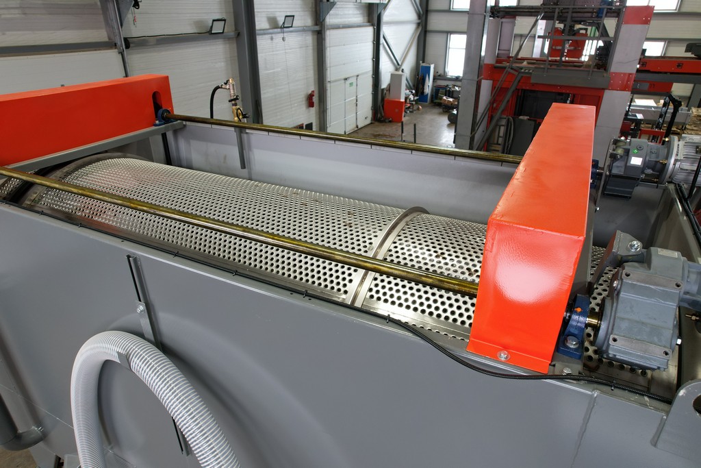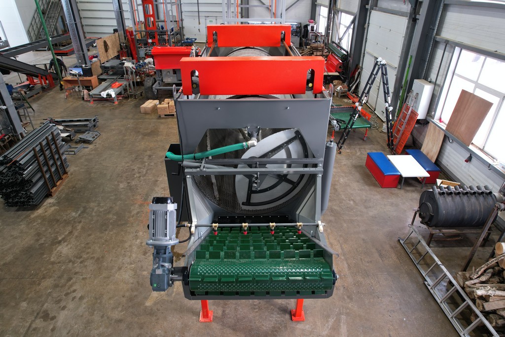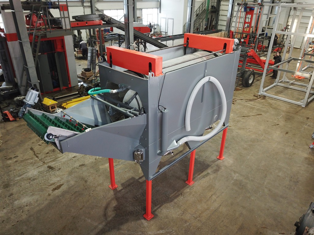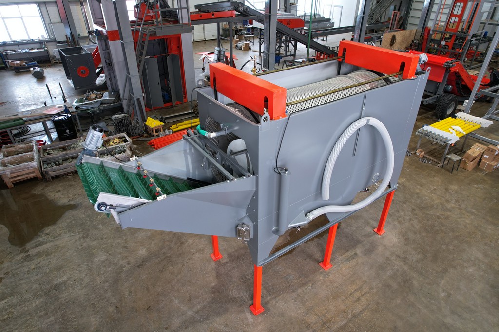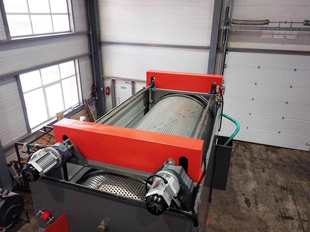 По загрузочному транспортеру продукт подается во вращающийся барабан, нижняя часть которого погружена в емкость с водой. В барабане по спирали установлены направляющие полозья из нержавеющей стали, продвигающие продукт в процессе мойки к выгрузному транспортеру. Сверху, вдоль всей длины моющего барабана, установлены омывающие форсунки, распыляющие воду под высоким давлением, чем и достигается основной эффект мойки продукта. На выгрузном транспортере установлены дополнительные форсунки, омывающие выходящий продукт чистой водой.