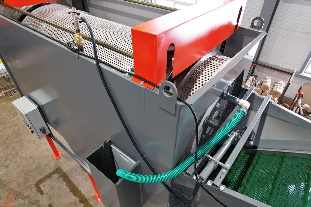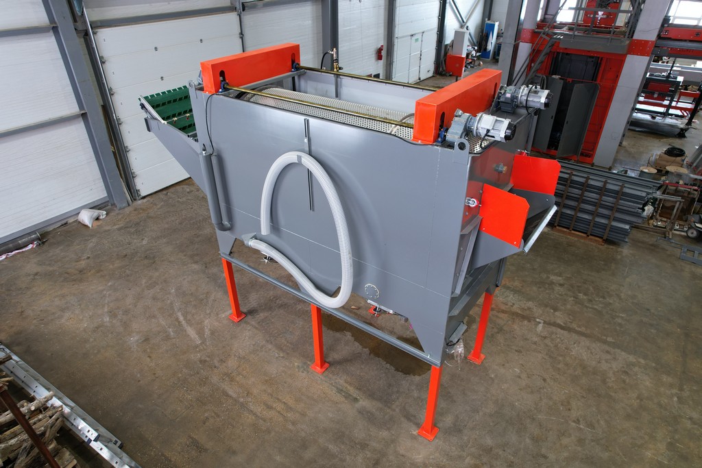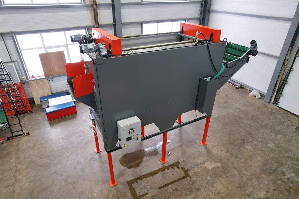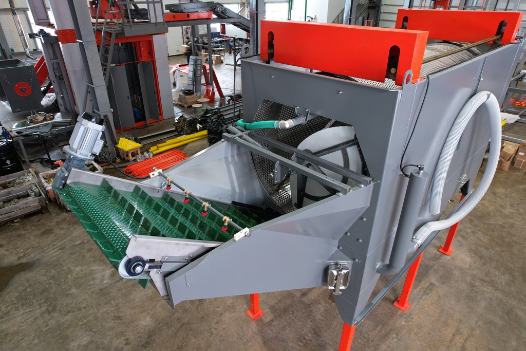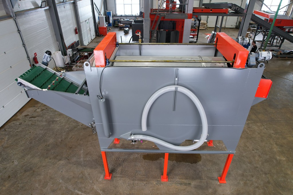 - Над выгрузным транспортером установлены дополнительные форсунки, омывающие выходящий продукт чистой водой.