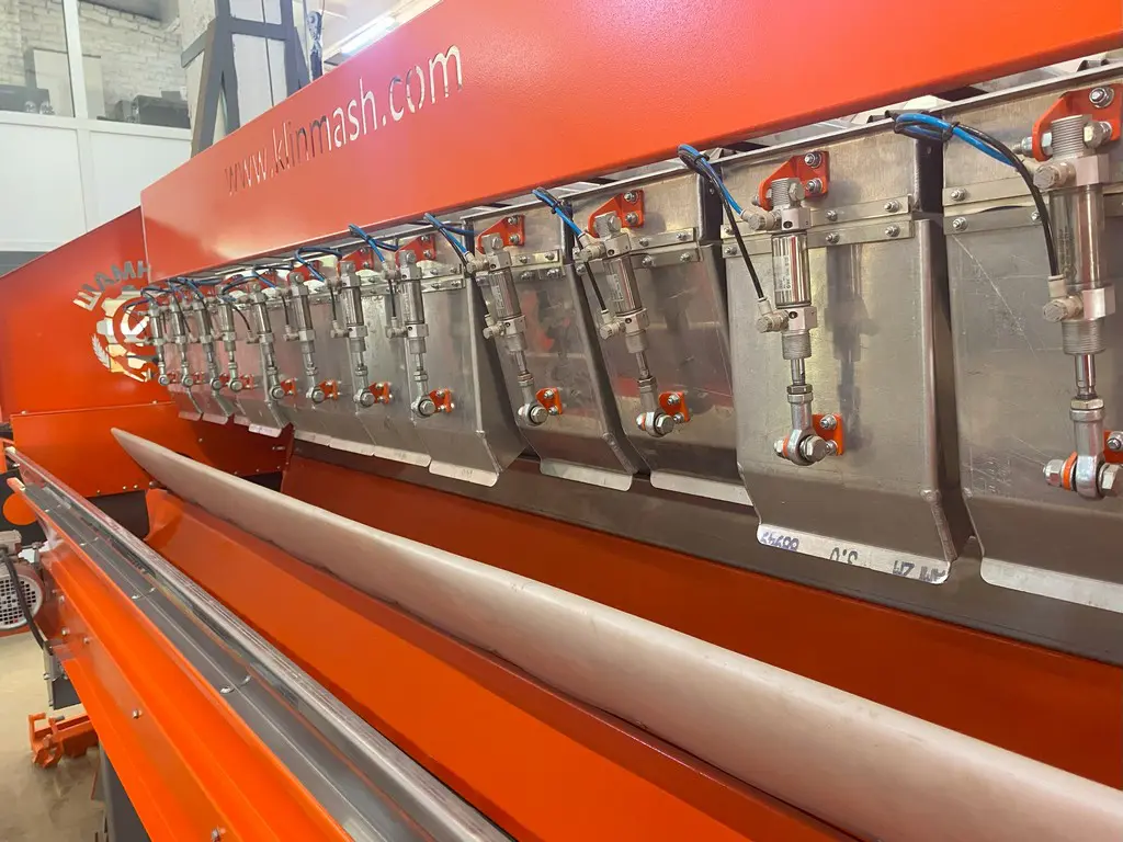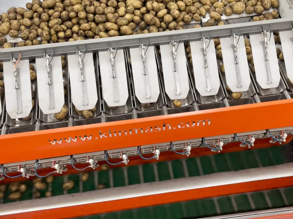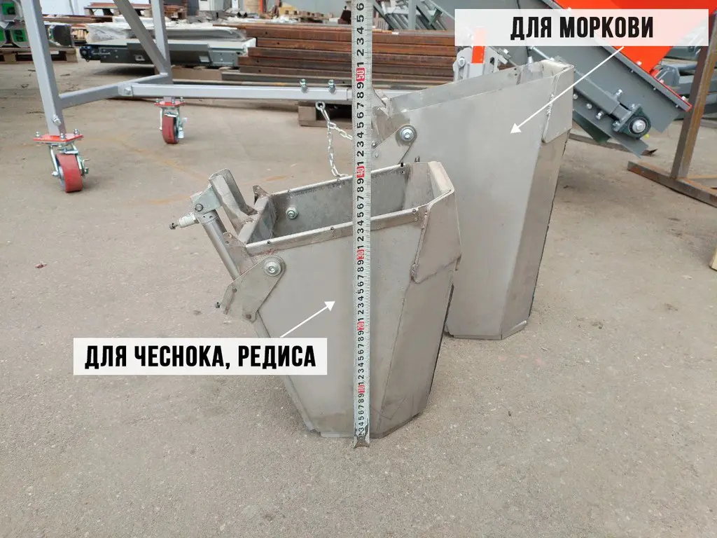 - Лента реверсивного транспортера, на которую выгружается продукт из бункера накопителя, оснащена специальными демпферными подушками для мягкого падения овощей.