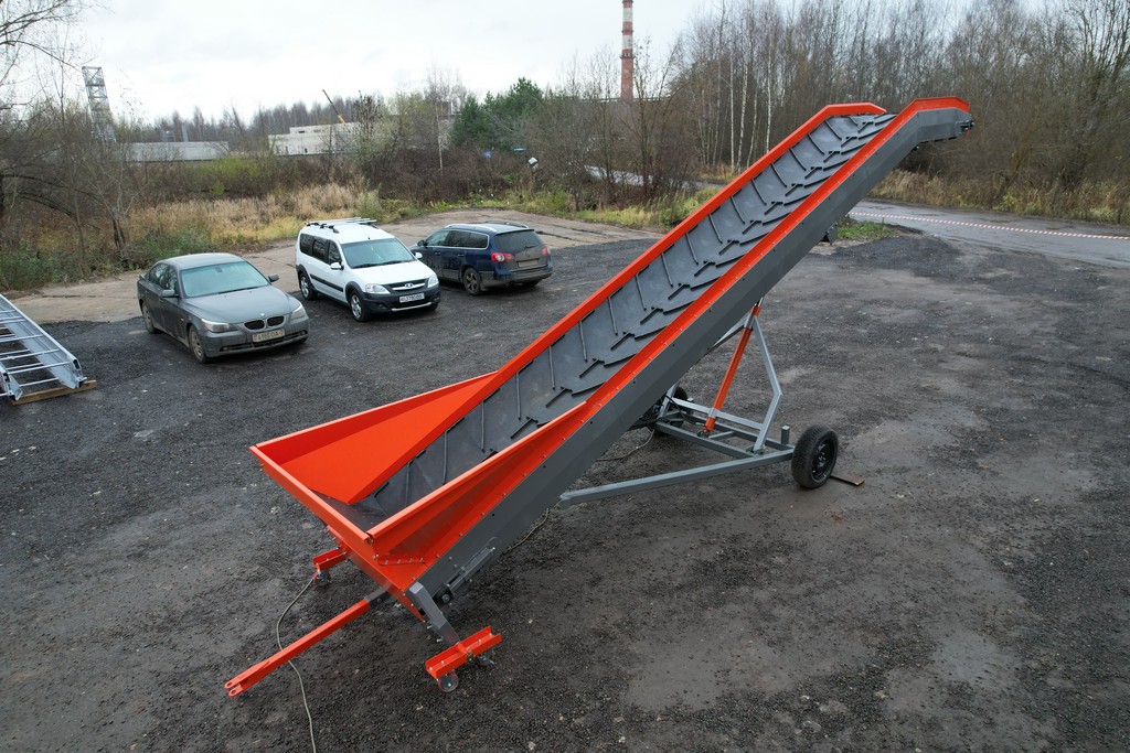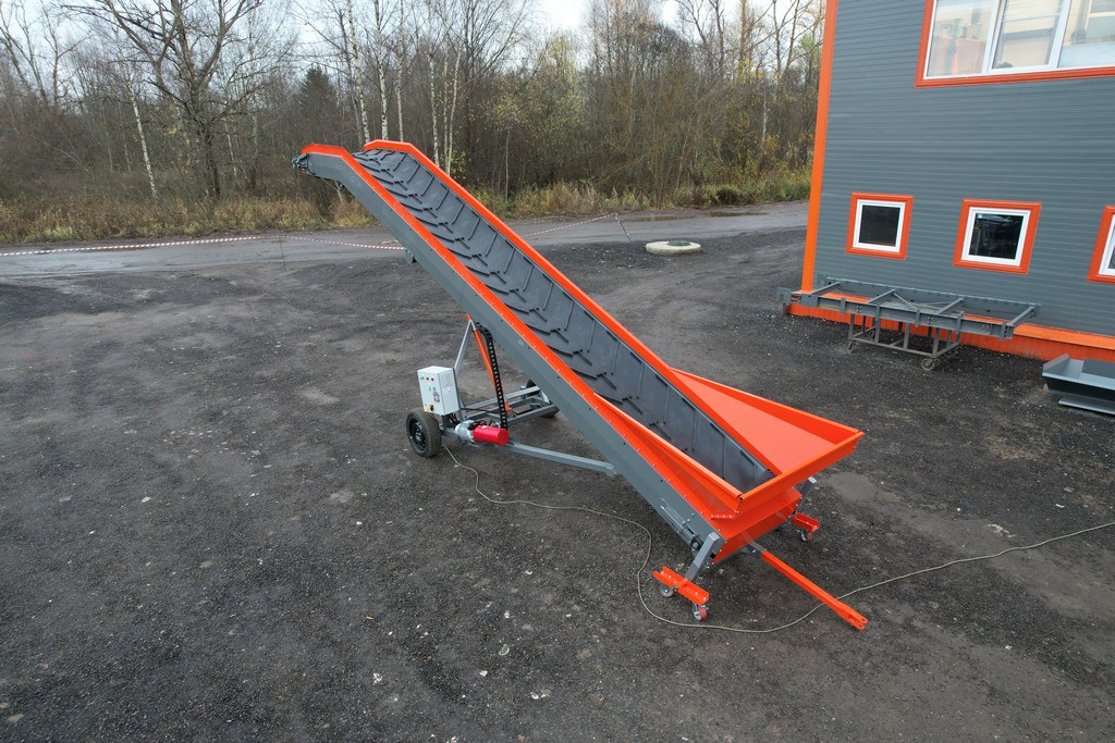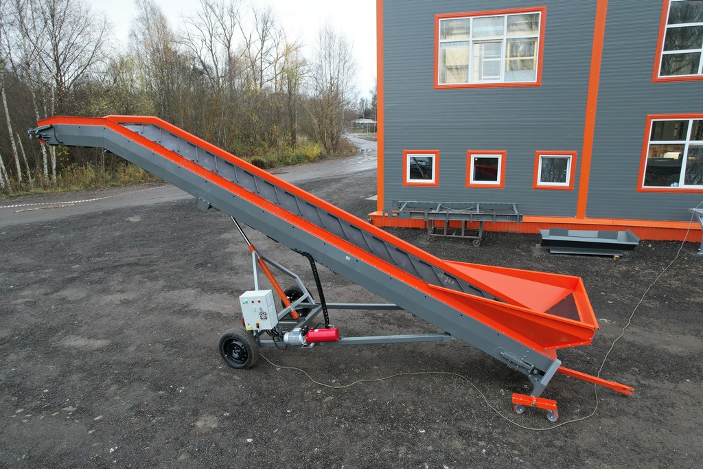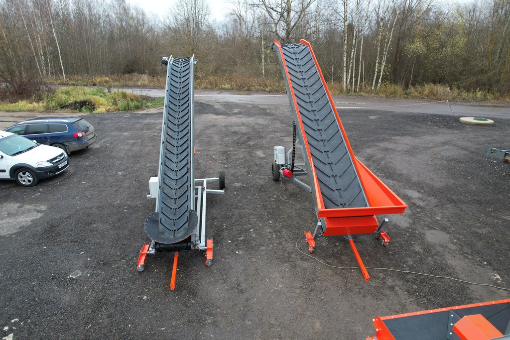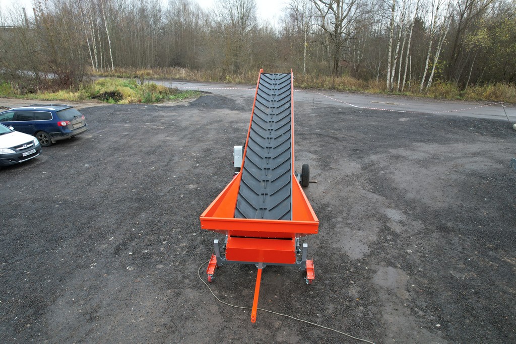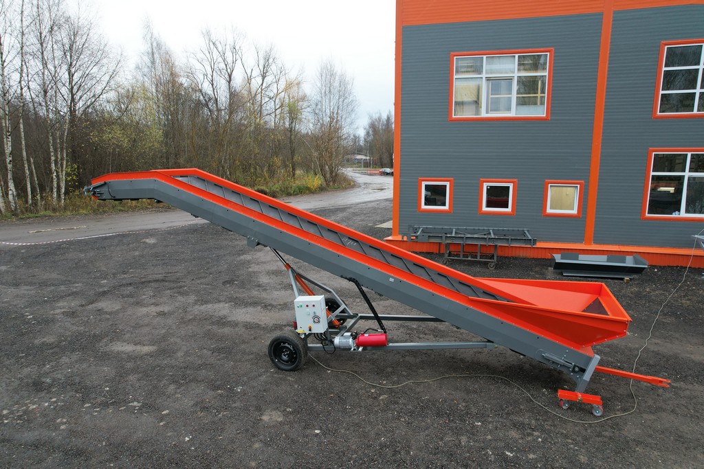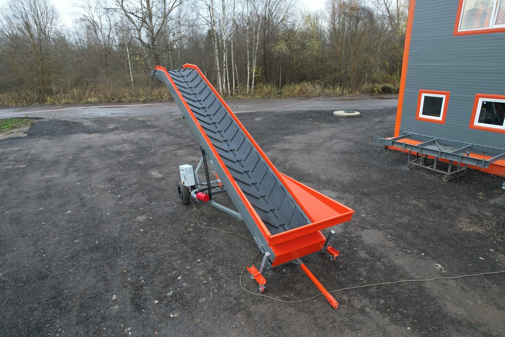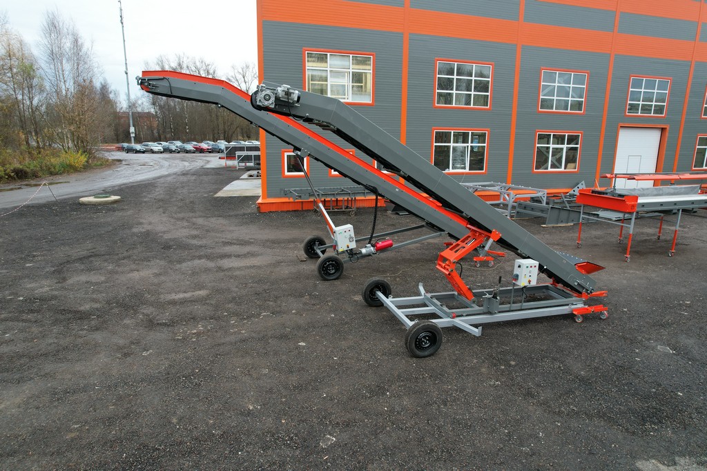 Продукт загружается в приемную горловину и по шевронной ленте перемещается в длину и на высоту для погрузки в транспортные средства, контейнеры, бункеры или устанавливается в технологические линии. Подъем стрелы происходит при помощи гидравлической станции 3 кВт. Скорость движения и ширина ленты обеспечивают производительность до 70 т/ч.