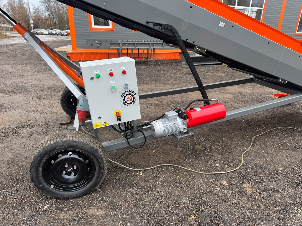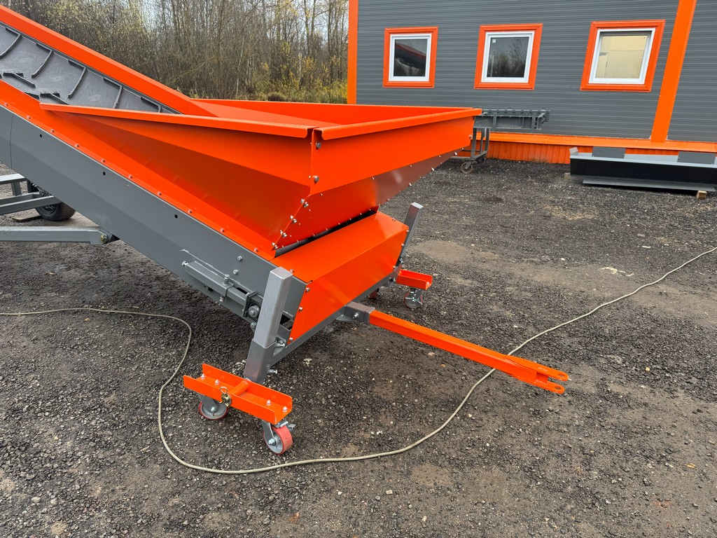 Продукт загружается в приемную горловину и по шевронной ленте перемещается в длину и на высоту для погрузки в транспортные средства, контейнеры, бункеры или устанавливается в технологические линии. Подъем стрелы происходит при помощи гидравлической станции 3 кВт. Скорость движения и ширина ленты обеспечивают производительность до 70 т/ч.