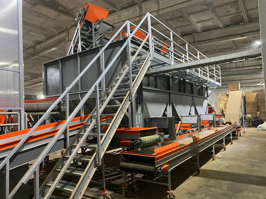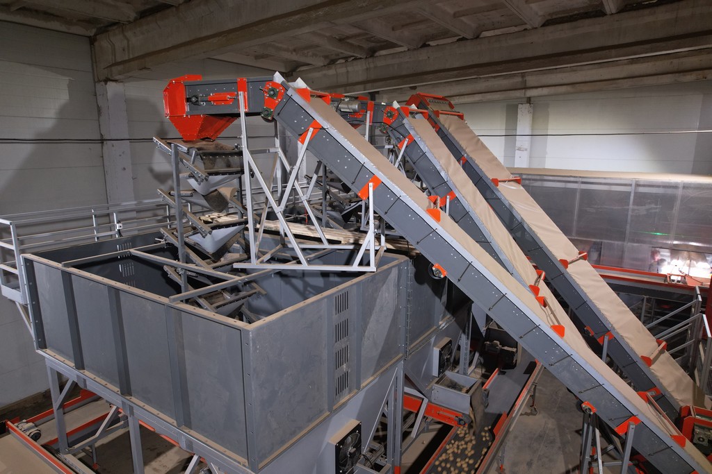 Продукт подается загрузочным транспортером в приемник-гаситель падения и по мягким резиновым ступеням опускается внутрь бункера. На дне бункера находится реверсивный транспортер. Он защищен сверху специальным купольным рассекателем. Это исключает «сдавливание» нижнего транспортера весом продукта. Для более длительного хранения, например на ночь или после мойки продукта, предусмотрен мощный вентилятор с донным воздуховодом, обеспечивающий равномерный обдув хранящихся овощей, что предотвращает их порчу. По мере наполнения бункера и исходя из потребностей технологической линии, оператор включает нижний реверсивный транспортер и продукт может подаваться в одну или другую сторону.
