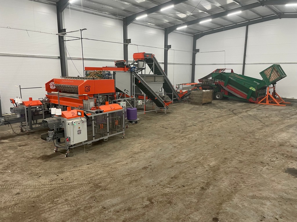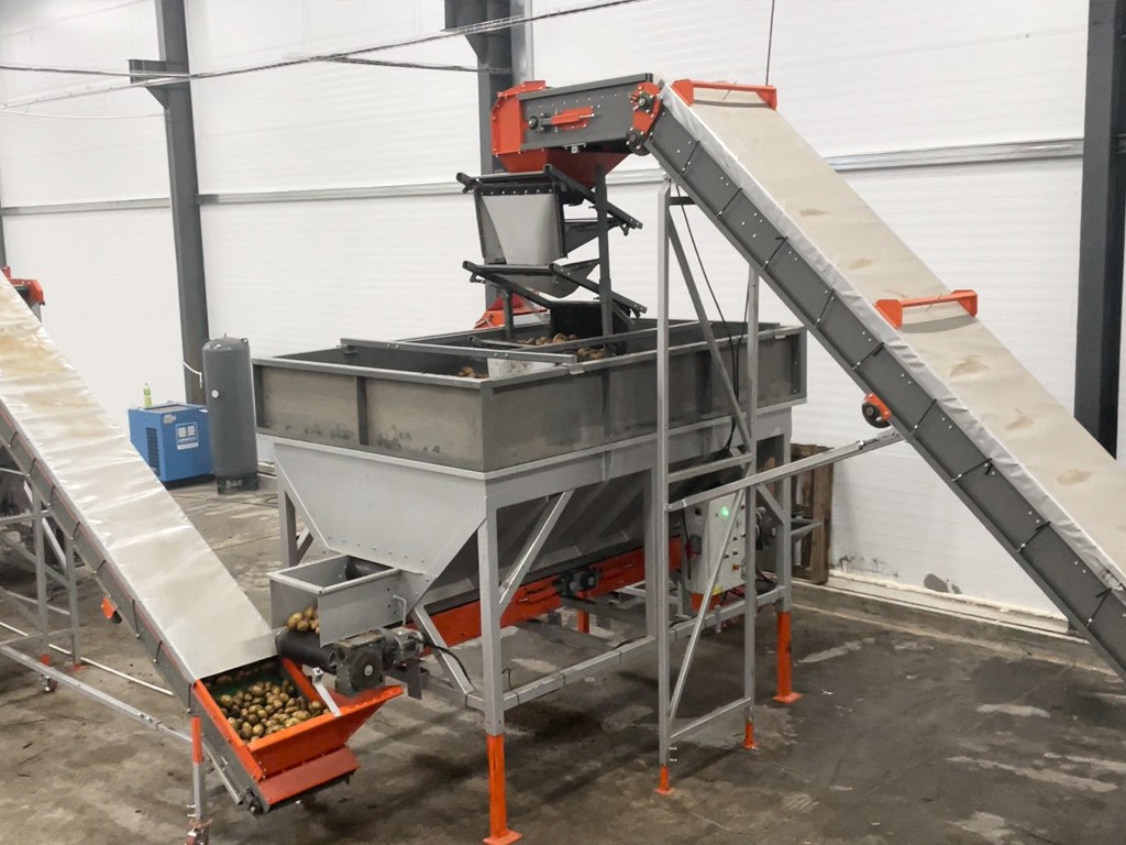 Продукт подается загрузочным транспортером в приемник-гаситель падения и по мягким резиновым ступеням опускается внутрь бункера. На дне бункера находится реверсивный транспортер. Он защищен сверху специальным купольным рассекателем. Это исключает «сдавливание» нижнего транспортера весом продукта. Для более длительного хранения, например на ночь или после мойки продукта, предусмотрен мощный вентилятор с донным воздуховодом, обеспечивающий равномерный обдув хранящихся овощей, что предотвращает их порчу. По мере наполнения бункера и исходя из потребностей технологической линии, оператор включает нижний реверсивный транспортер и продукт может подаваться в одну или другую сторону.