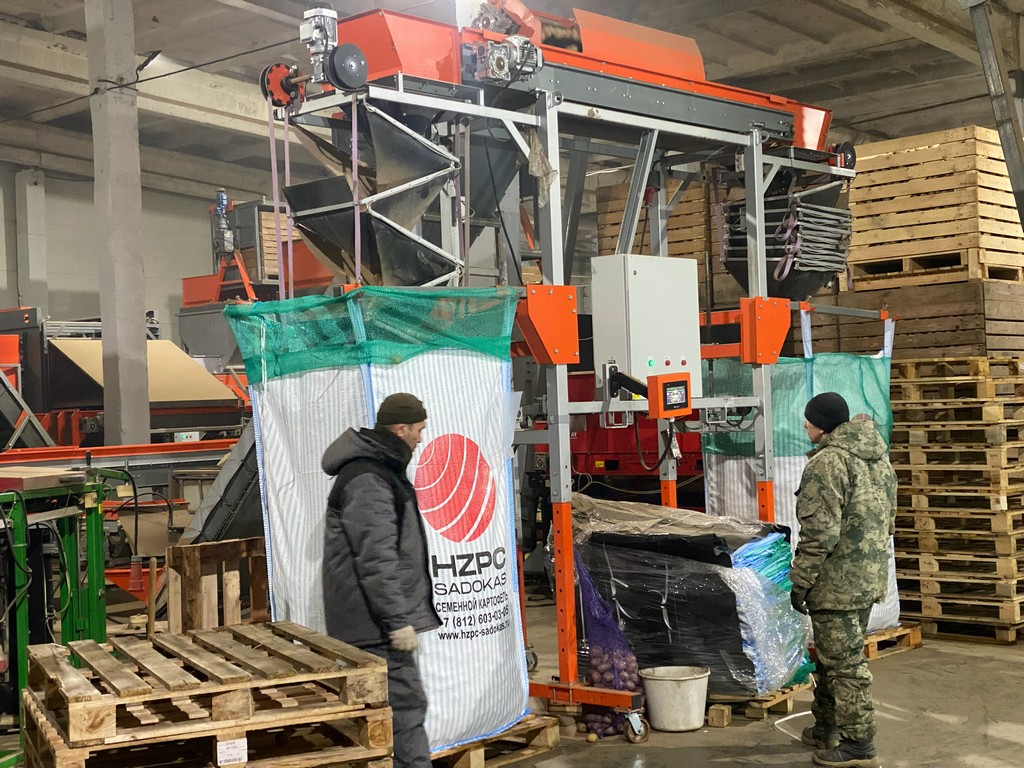 Двухсторонний весовой наполнитель применяется для автоматического заполнения контейнеров и биг-бэгов при закладке овощей в хранилище или выгрузки с хранения, но при этом модификация УЗ-2В оснащена двумя весовыми платформами. Каждая платформа имеет 4 тензодатчика, которые сообщают информацию о весе на цифровые индикаторы. Тензодатчики через индикаторы передают обработанные данные на контроллер и жидкокристаллический сенсорный монитор, что позволяет взвешивать продукт перед отгрузкой в биг-бэгах или перед закладкой на хранение в контейнерах, суммируя и фиксируя общий вес отгруженной или заложенной на хранение партии.