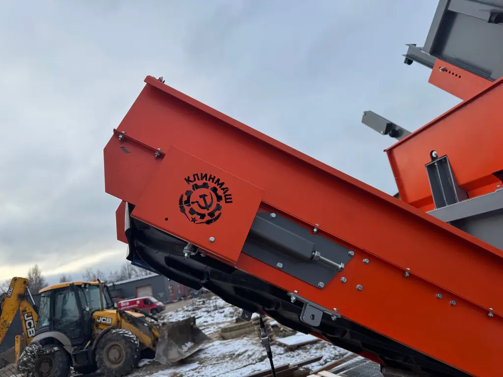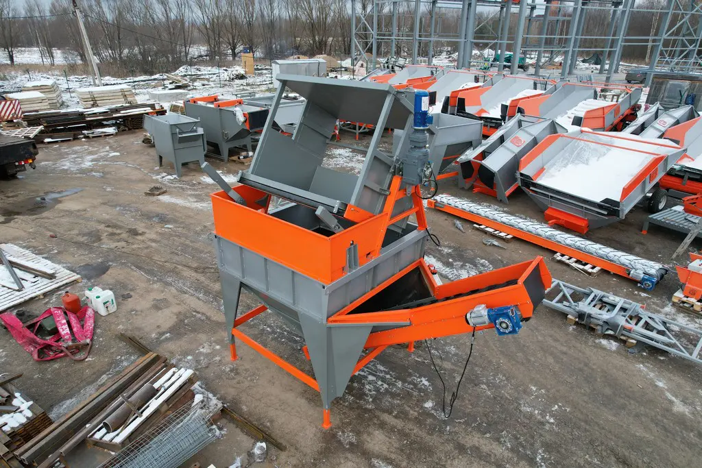 - Платформа опрокидывания имеет движущуюся заслонку, которая открывается при достижении определенного угла и предотвращает рассыпание продукта в процессе опрокидывания. Нижний реверсивный выгрузной транспортер с обрезиненным приводным валом может подавать продукт в обе стороны, давая возможность гибко перестраивать линию, без перемещения самого бункера.