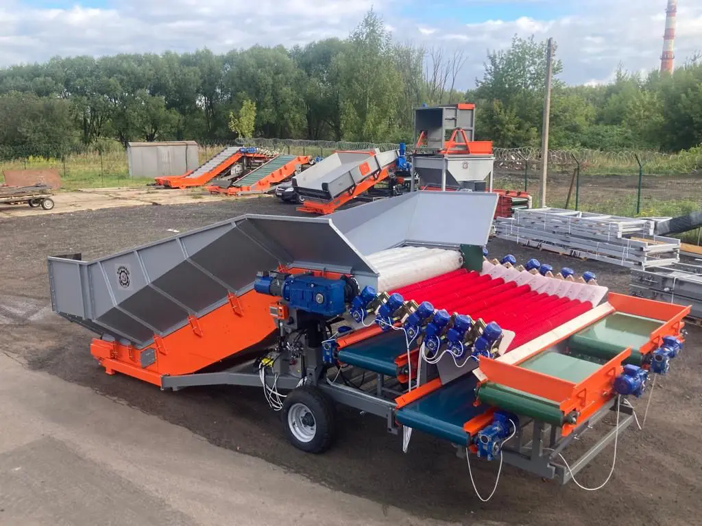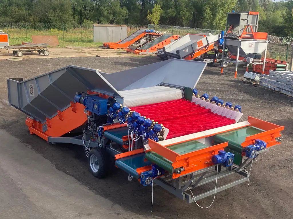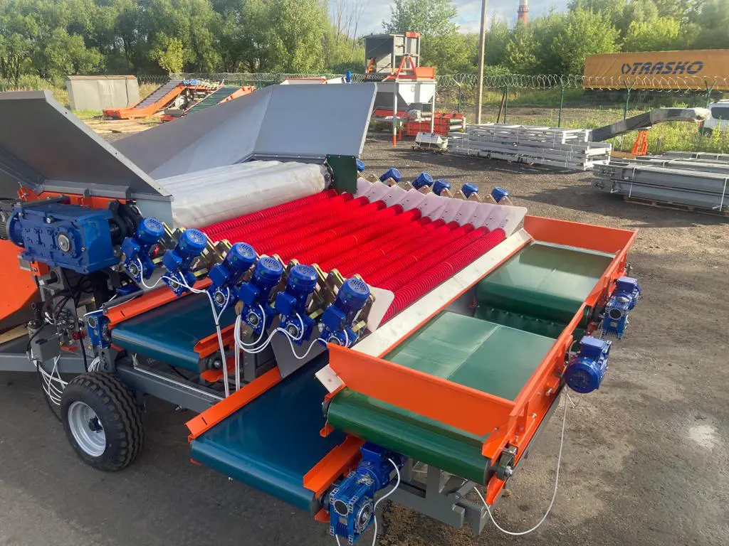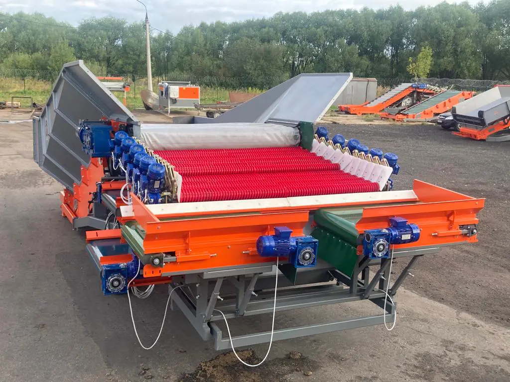 Поступающая с поля продукция выгружается из самосвала в кузов сортировочного бункера, попадая на широкую ленту донного транспортера. Далее продукт поступает на земле-ворохоотделяющий модуль, состоящий из шести спиральных вальцов, а затем на сепарирующий модуль, который тоже состоит из шести валов с резиновыми звездочками или из шести полиуретановых валов (в зависимости от пожеланий заказчика). Продукт очищается от земли и мусора, просеивается между калибровочными валами, разделяясь на три фракции. Первые две фракции попадают на реверсивные отводящие транспортеры. Третья фракция попадает на два отдельных транспортера, направляющих продукт к центру для последующей его подачи на технологическую линию. При использовании дополнительного пруткового транспортера можно отделить четвертую фракцию — товарный бэби-картофель или семенной материал.