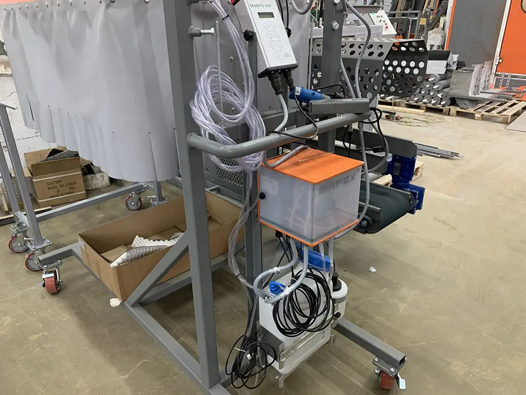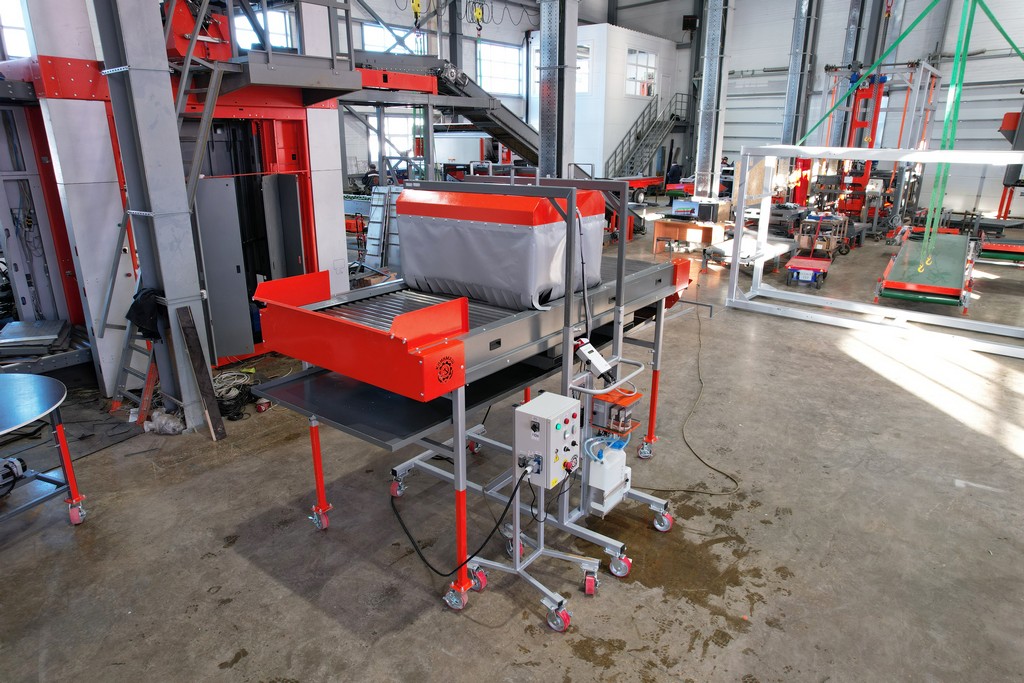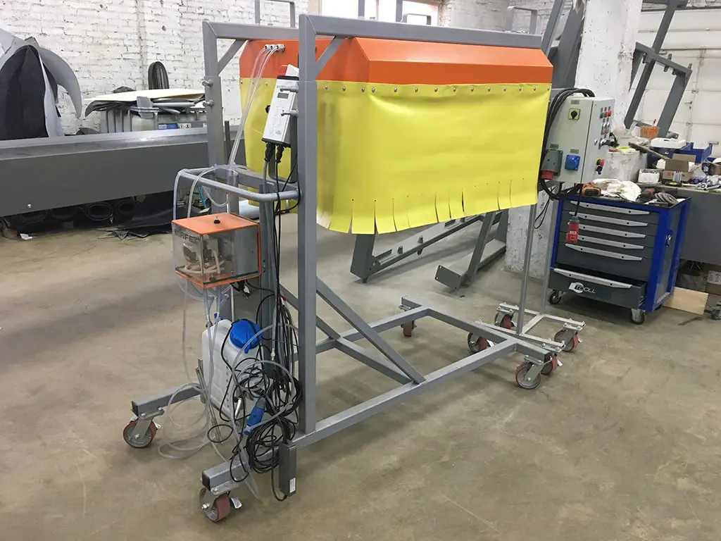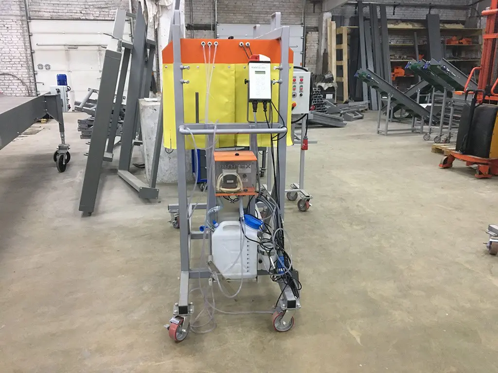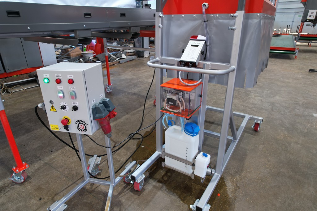 - Шкаф управления всем протравливающим комплексом размещается на отдельной передвижной платформе и используется, как для обеспечения работы только самого роликового инспекционного стола, так и для его функционирования совместно с подкатной распыляющей установкой.