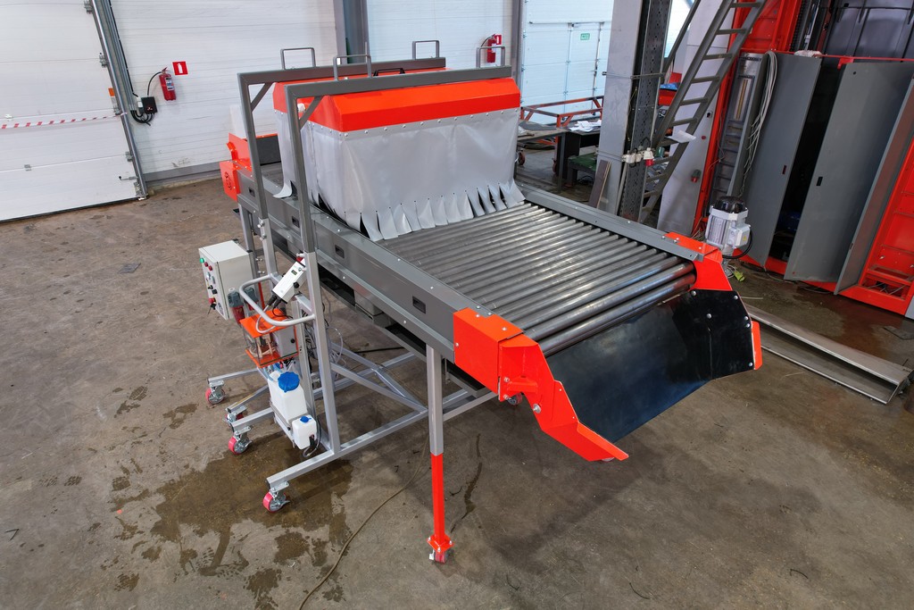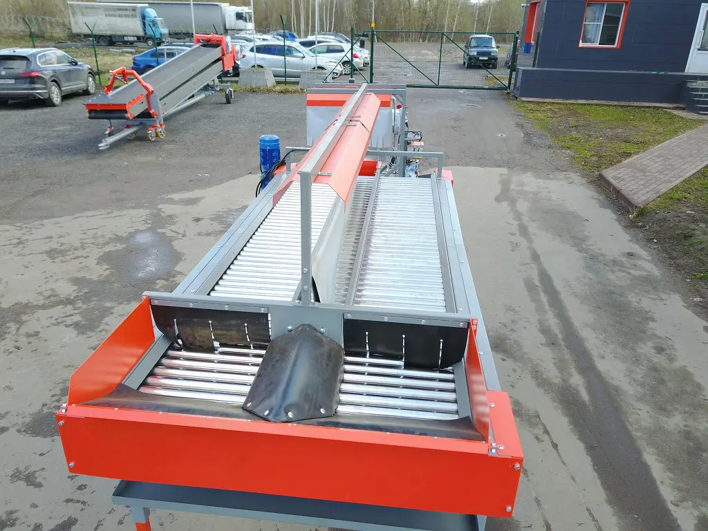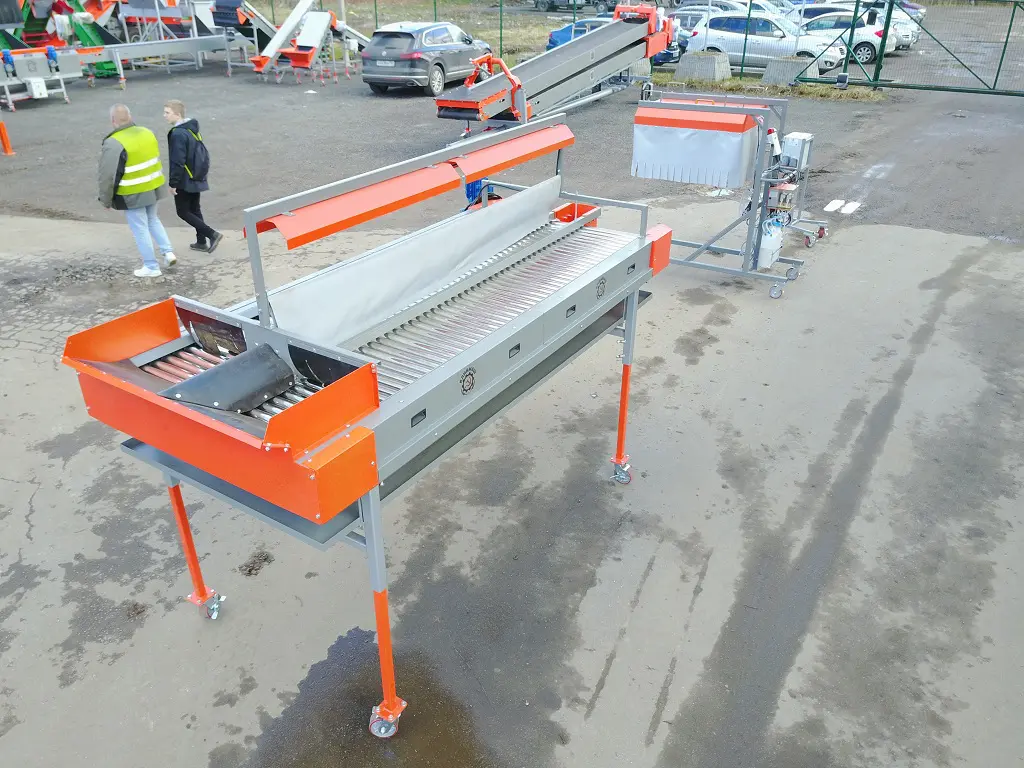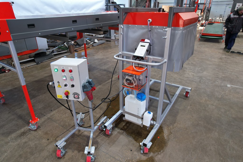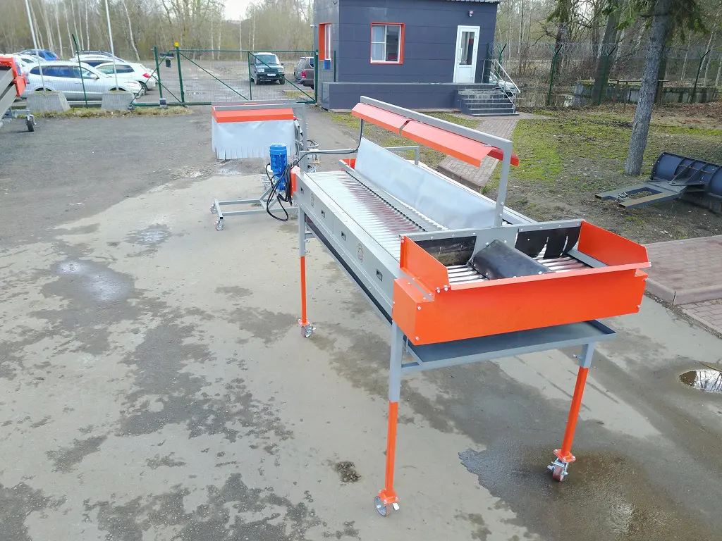 - Протравливающий комплекс создан на основе роликового инспекционного стола особой комплектации. По окончании обработки клубней подкатная протравливающая установка распыления откатывается на склад. На инспекционном столе устанавливают разделители потоков, освещение и выгрузной лоток. И данный инспекционный стол можно продолжать использовать для сортировки продукта.