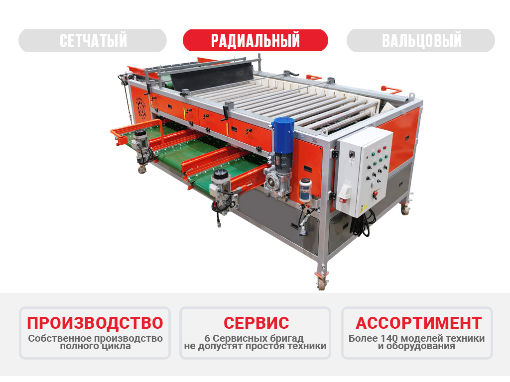 Также в линейке выпускаемой заводом вы сможете найти рамочные сортировочные калибровщики РСК-4 / РСК-5, Радиальные калибровщики РК-3-12/РК-4-12, Сетчатый калибровщик СК-90.