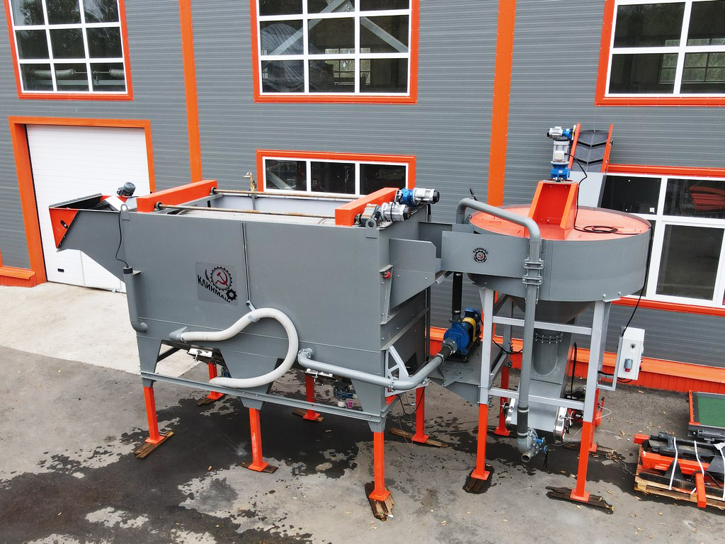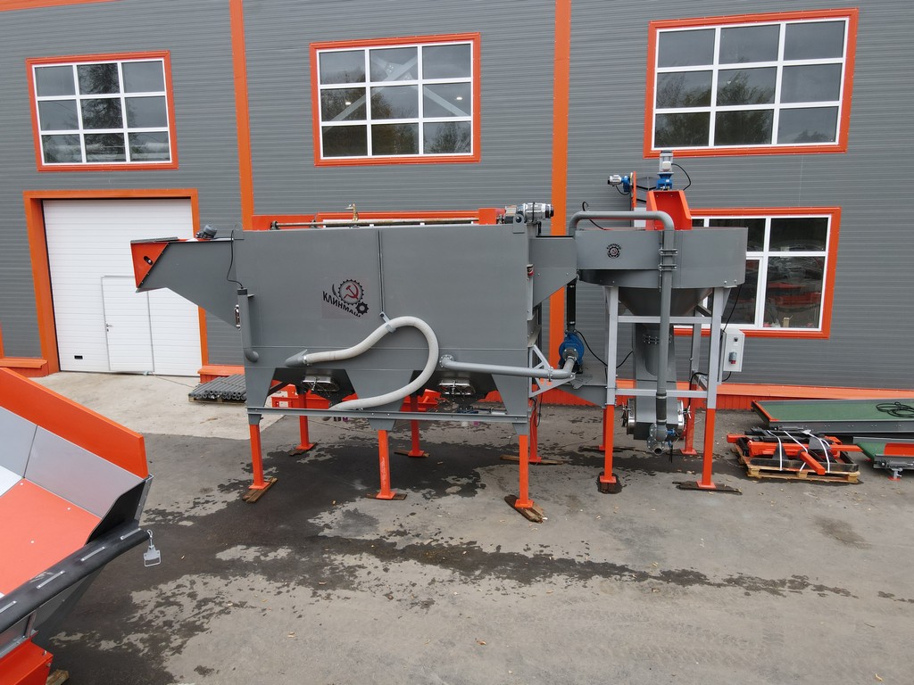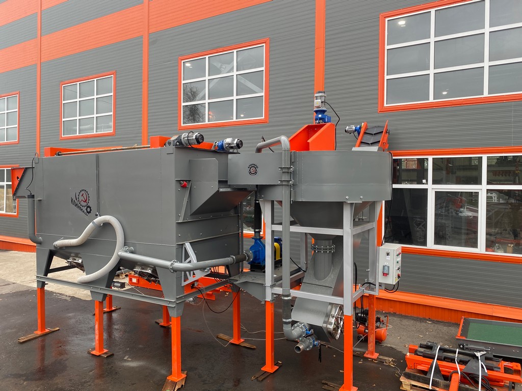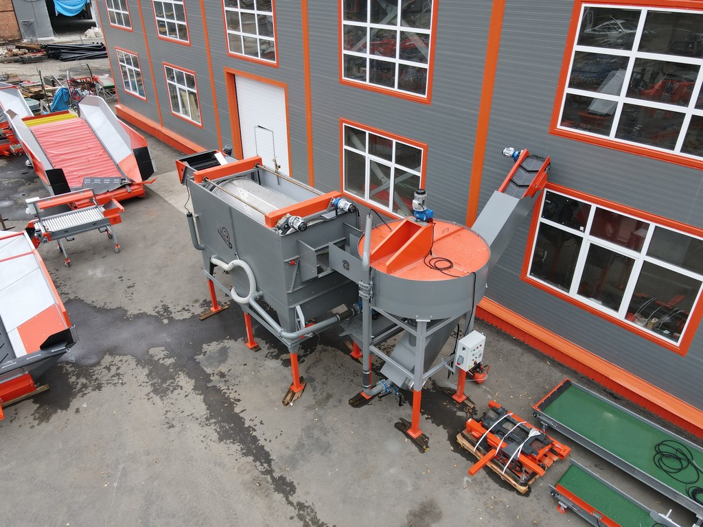 - Камнеуловитель может работать как отдельная машина. Для этого он комплектуется дополнительным резервуаром воды, дренажным насосом и наклонной платформой для скатывания овощей и возврата воды.