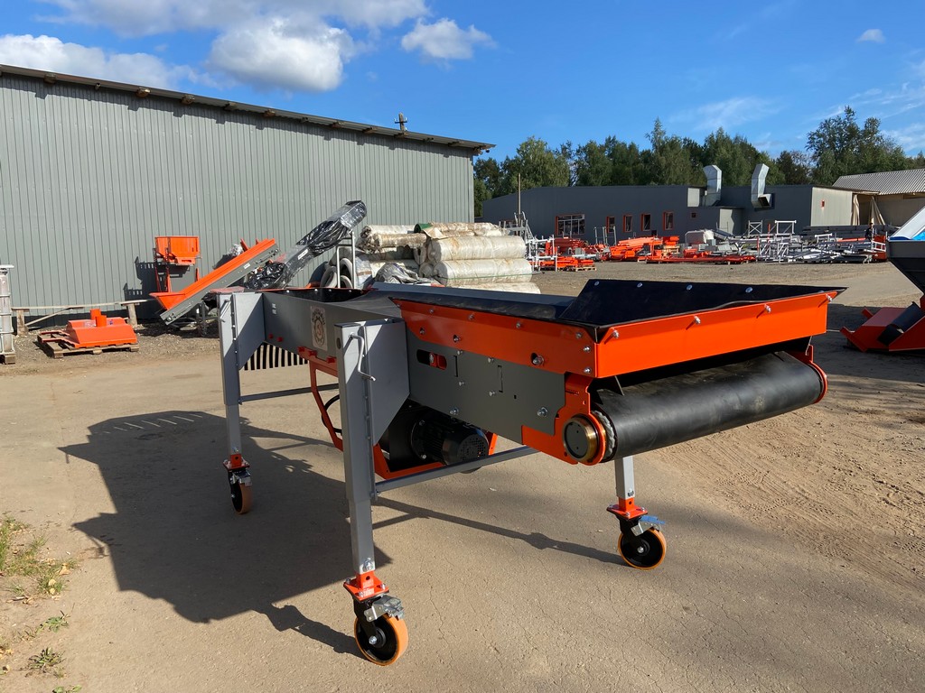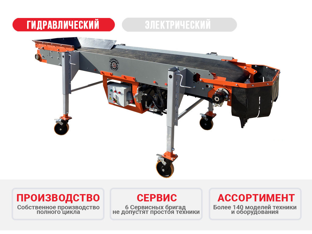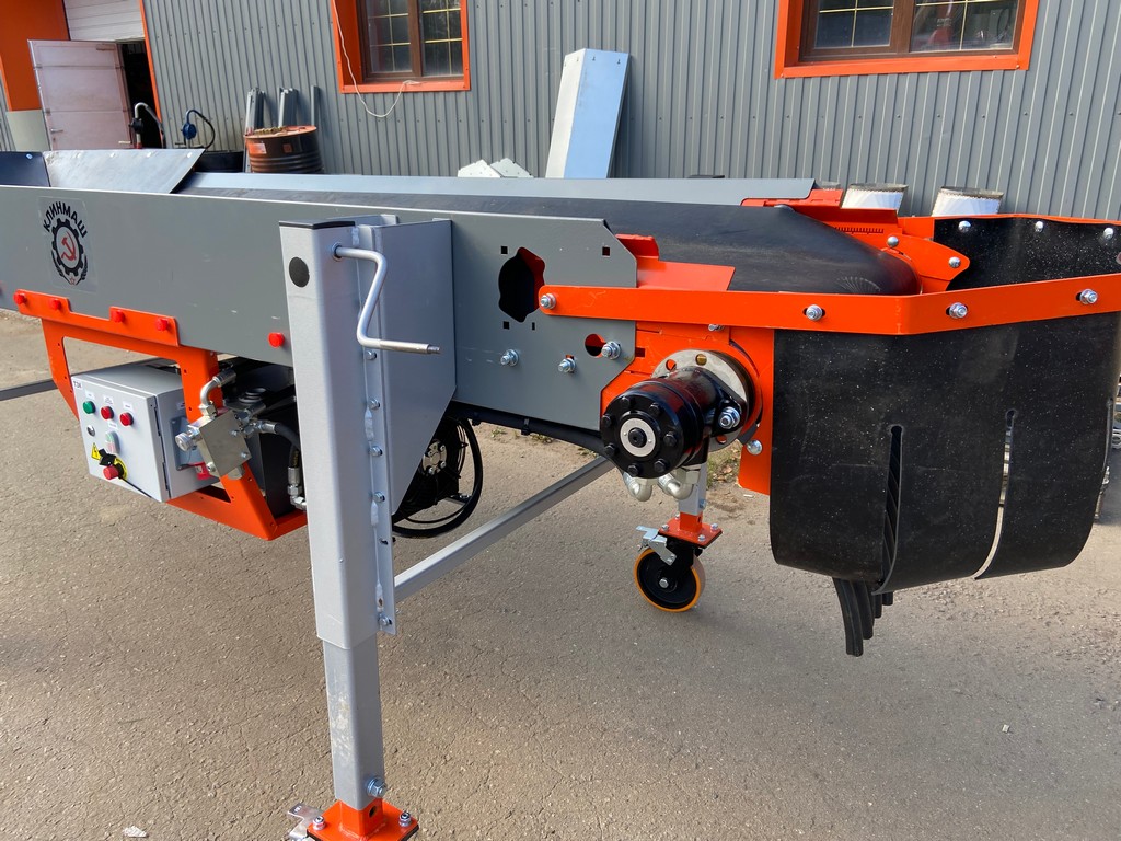 Многослойная резинотканевая транспортерная лента приводится в движение с помощью мотор-редуктора или гидростанции. Высота наклона выгрузки продукта изменяется с помощью опорных телескопических ножек.