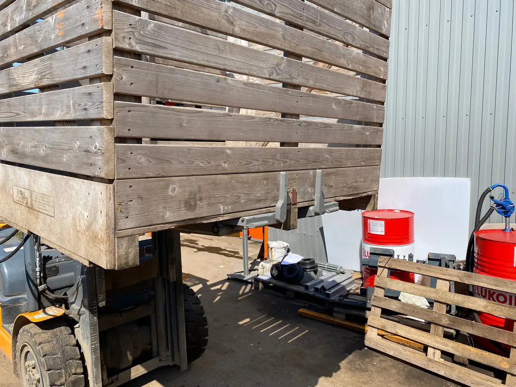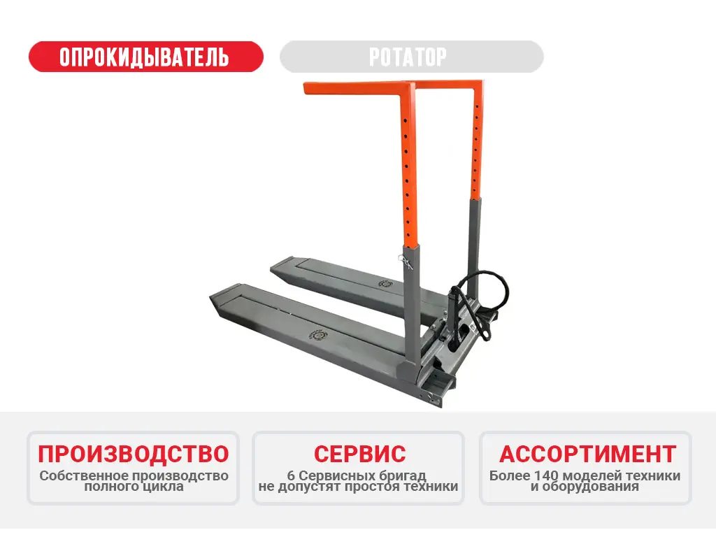 Вилочный опрокидыватель контейнеров — это мобильное гидравлическое оборудование, навешиваемые на самоходные погрузчики грузоподъемностью от 1.5 до 5.5 тонн, предназначенное для выгрузки продукта из деревянных овощных контейнеров в транспортные средства, приемный бункер или другие накопители.