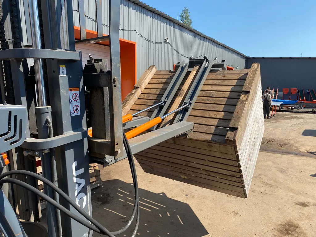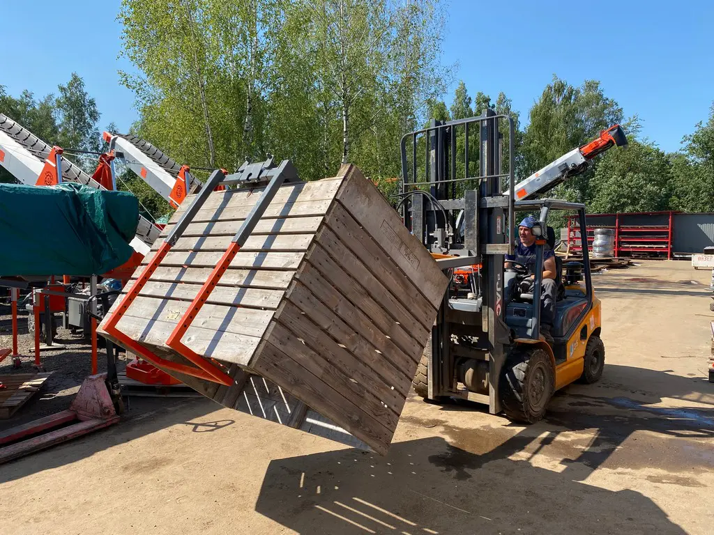 Данное оборудование позволяет зафиксировать специальным захватом контейнер с продукцией (овощи или фрукты) на погрузчике без дополнительной техники.