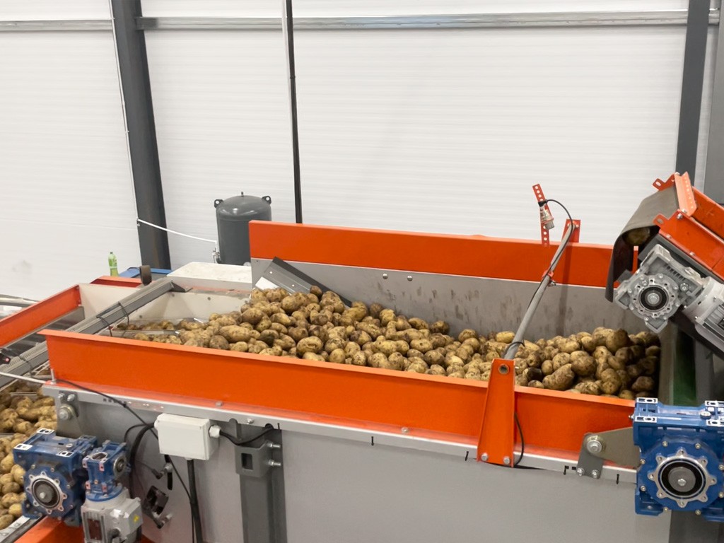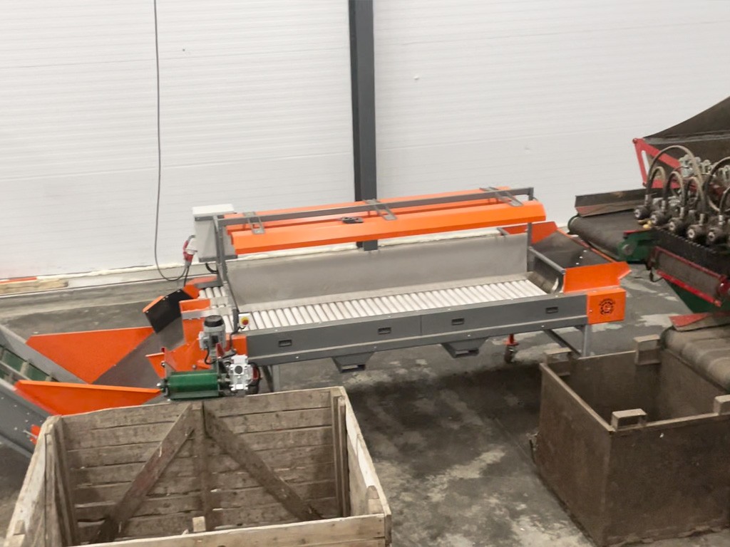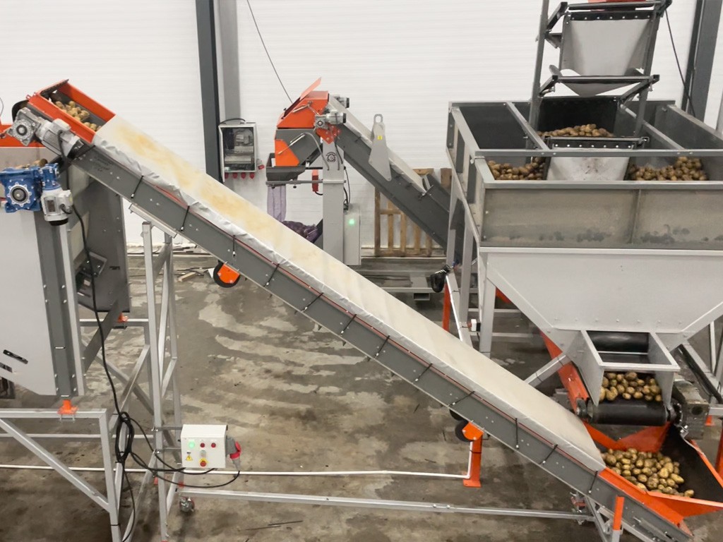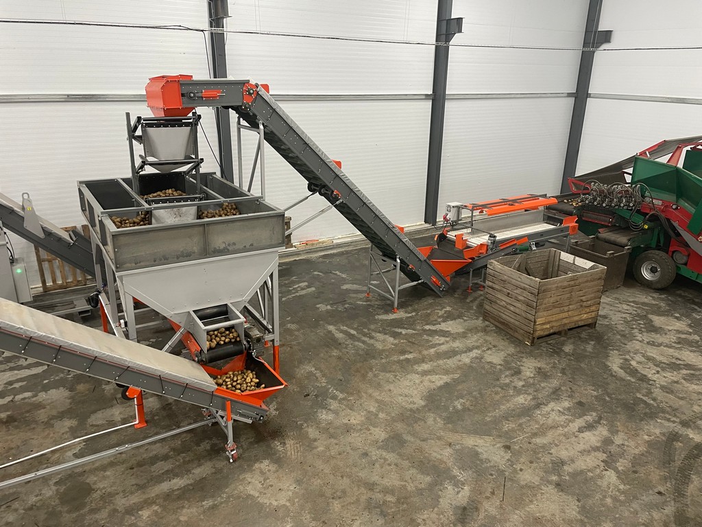 Линия начинается с узла приёма: опрокидыватель контейнеров и приемно-сортировочный бункер. Здесь картофель проходит первичную сортировку и отделение мусора и грязи. Далее наиболее крупная фракция поступает прямо на инспекционный стол РИ-3Т и проходит более тщательную ручную сортировку и отделение некондиции.