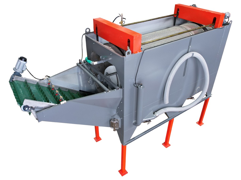 с направляющими лопатками внутри моечного барабана, и отверстиями, выполненными особым способом пуклевки. В базовой комплектации предлагается ленточный транспортер, загрузочные лопатки которого имеют прорези и наклеены под углом для стока воды, дополнительная опция — голландский прутковый обрезиненный транспортер. Учитывая небольшую длину, привод моечного барабана осуществляется ОДНИМ мотор — редуктором. На выходе продукт тоже омывается верхними форсунками. Так же может работать в автоматическом режиме, настройки меняются на сенсорном ж/к экране.